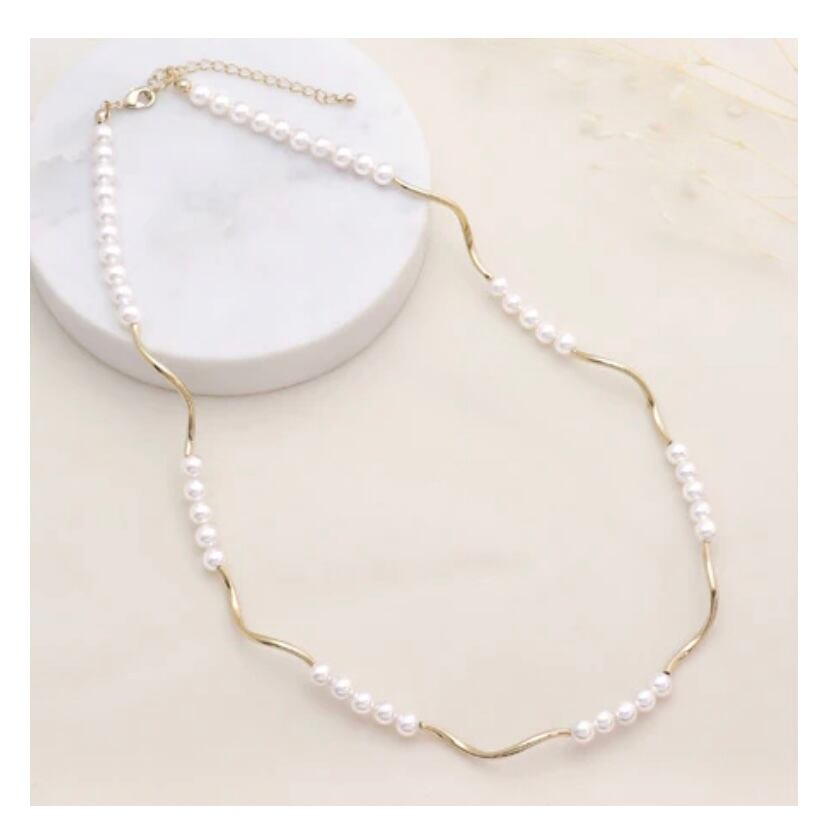 優雅なパールと波型パーツの組み合わせが特徴のこのネックレスは、シンプルながらも洗練された印象を与えるアイテムです。