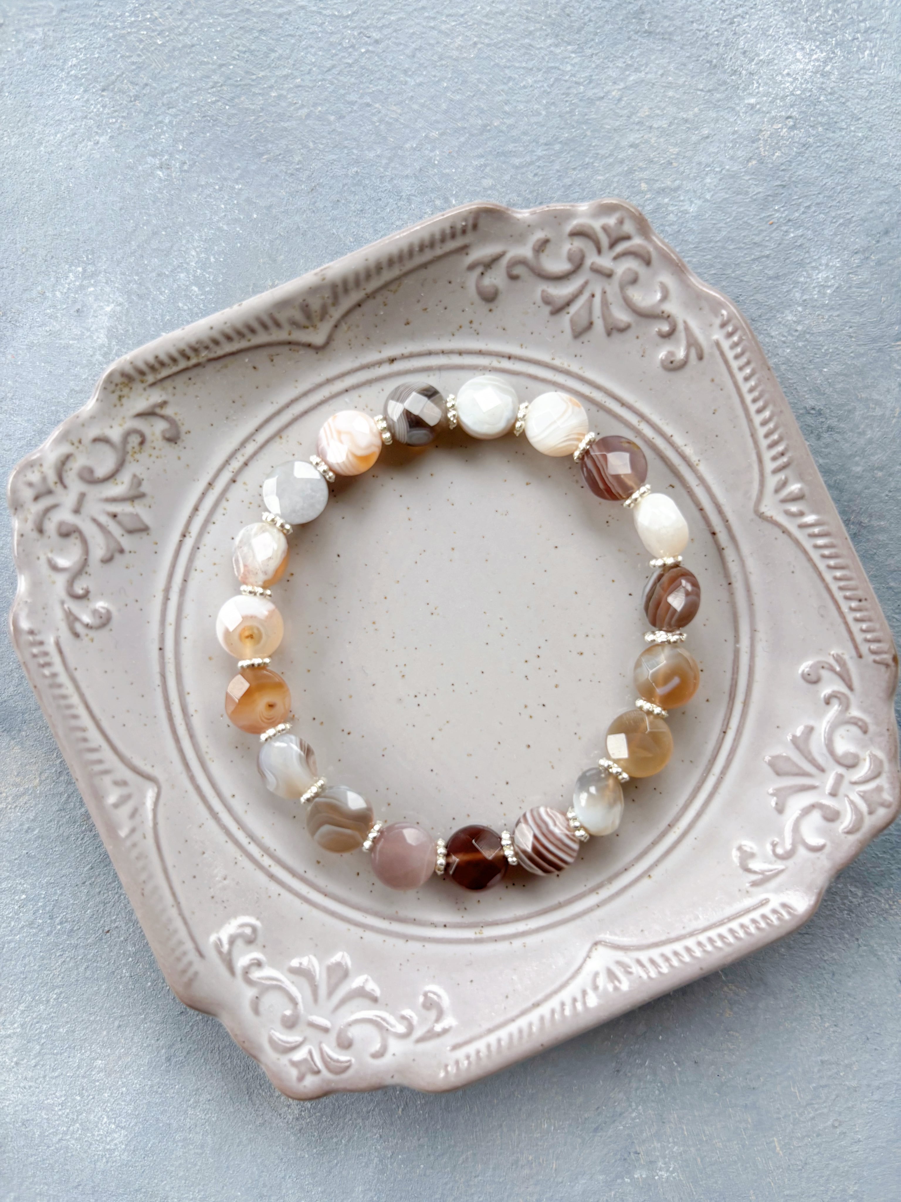 天然石メノウを使用したこのブレスレットは、大人のカラーで落ち着きのあるデザインが特徴です。